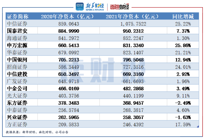 對已披露2021年年報的26家上市券商,合計期末凈資本超過1萬億,較上年增加超1成。其中,中信證券的期末凈資本超過千億元,國泰君安的凈資本超過900億元。值得一提的是,中信證券在2022年年初通過配股募得資金超220億元。