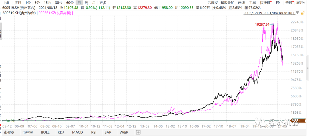 圖1、貴州茅臺(黑色)和長春高新(粉色)復權后股價走勢