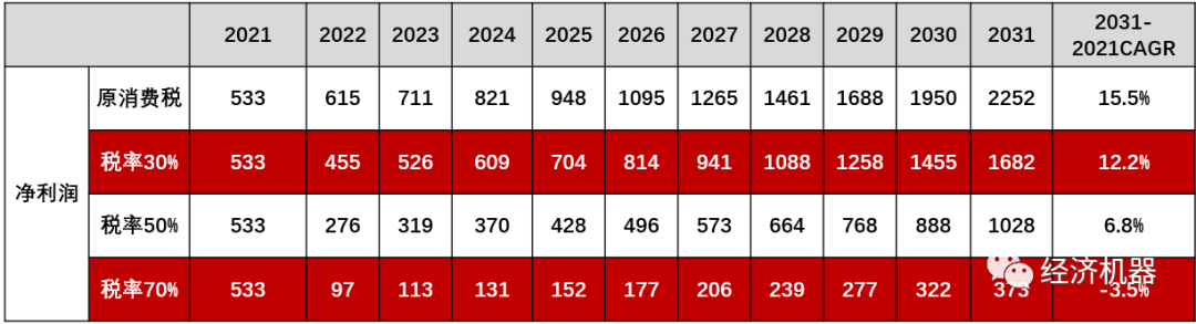 圖2、不同消費稅率情景下,茅臺未來十年凈利潤增速
