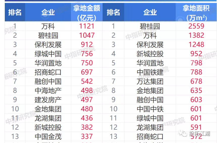 中指公布的今年1-8月拿地排行榜