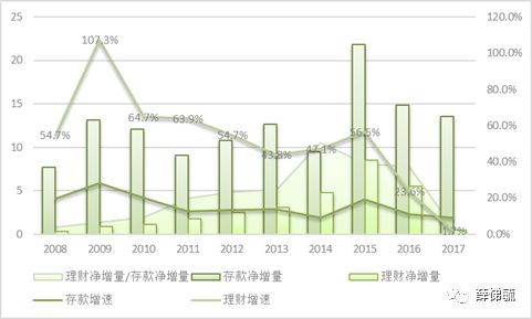 圖1.2008-2017年銀行理財(cái)凈增量、金融機(jī)構(gòu)存款凈增量及增速