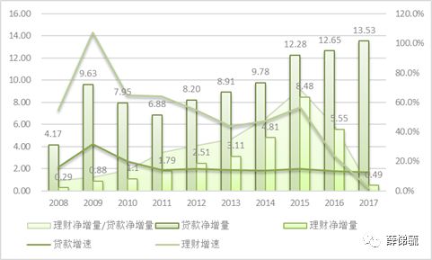 圖3.2008-2017年銀行理財(cái)凈增量、金融機(jī)構(gòu)貸款凈增量及增速