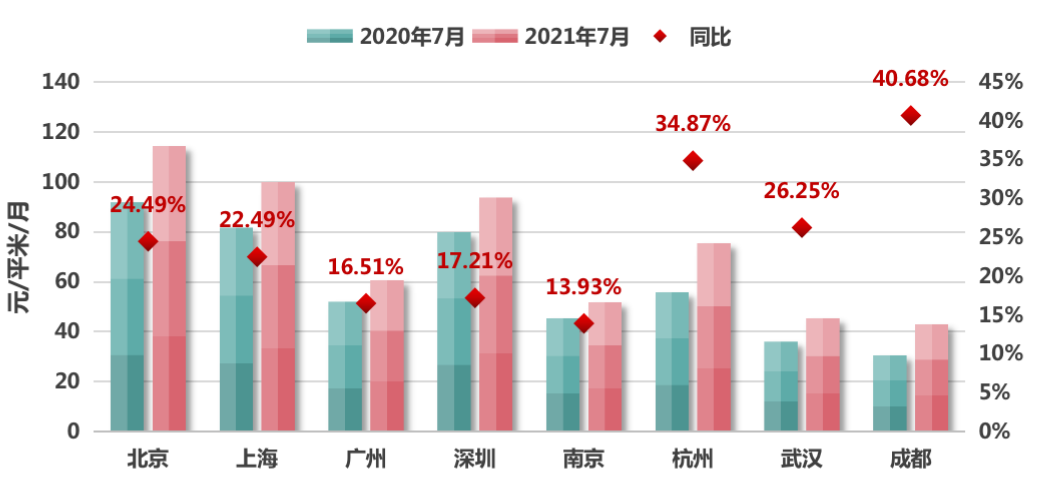 其中,北京、上海、廣州、深圳、南京、杭州、武漢、成都為租賃市場較為典型的核心八個城市,核心八城個人房源租金水平來看,達(dá)到73.08元/平米/月,相比去年同期平均水平大幅上漲24.55%。