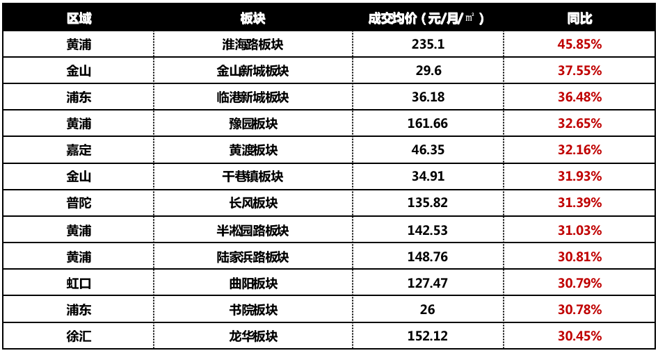 分板塊來看,上海統(tǒng)計的108個板塊中,2021年7月個人房源平均價格上漲的板塊高達(dá)97個,其中漲幅超過30%的板塊達(dá)12個,多數(shù)位于中內(nèi)環(huán)區(qū)域,漲幅10%-30%之間的板塊有75個,占全部板塊的70%,全市多數(shù)板塊呈現(xiàn)不同幅度的租賃市場高熱度。