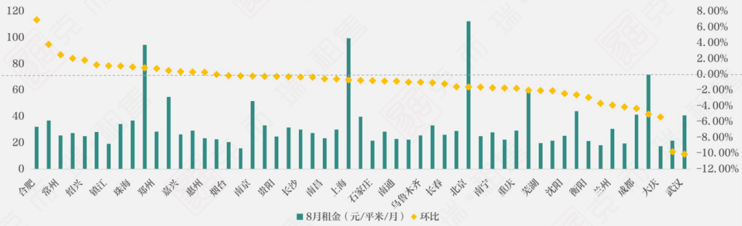 在一系列調(diào)控政策下,2021年8月,55城個人房源租金為33.67元/平米/月,環(huán)比下跌1.12%,隨著畢業(yè)旺季的逐漸消退,旺季效應(yīng)開始減弱,租賃需求開始下降,租金開始止?jié)q轉(zhuǎn)跌,進(jìn)入傳統(tǒng)淡季。全國各地大力發(fā)展保障性租賃住房,這對于個人房源租金也有一定影響。