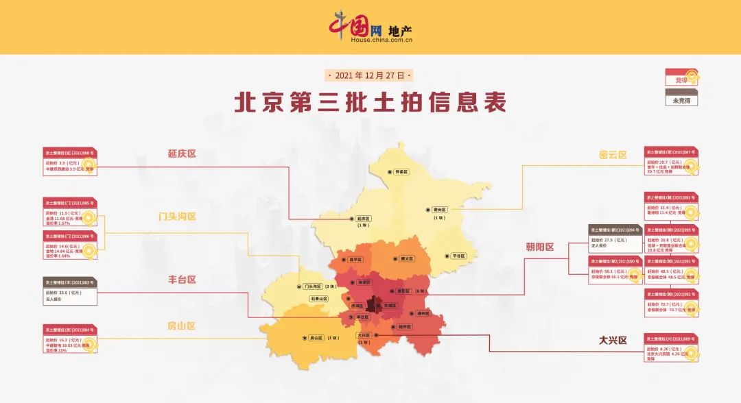 金地、融創、卓越3家民企均拿4宗地,旭輝聯合拿地3宗,龍湖、碧桂園各取得2宗。建發首進京城,在朝陽崔各莊拿下政府共有產權地塊。