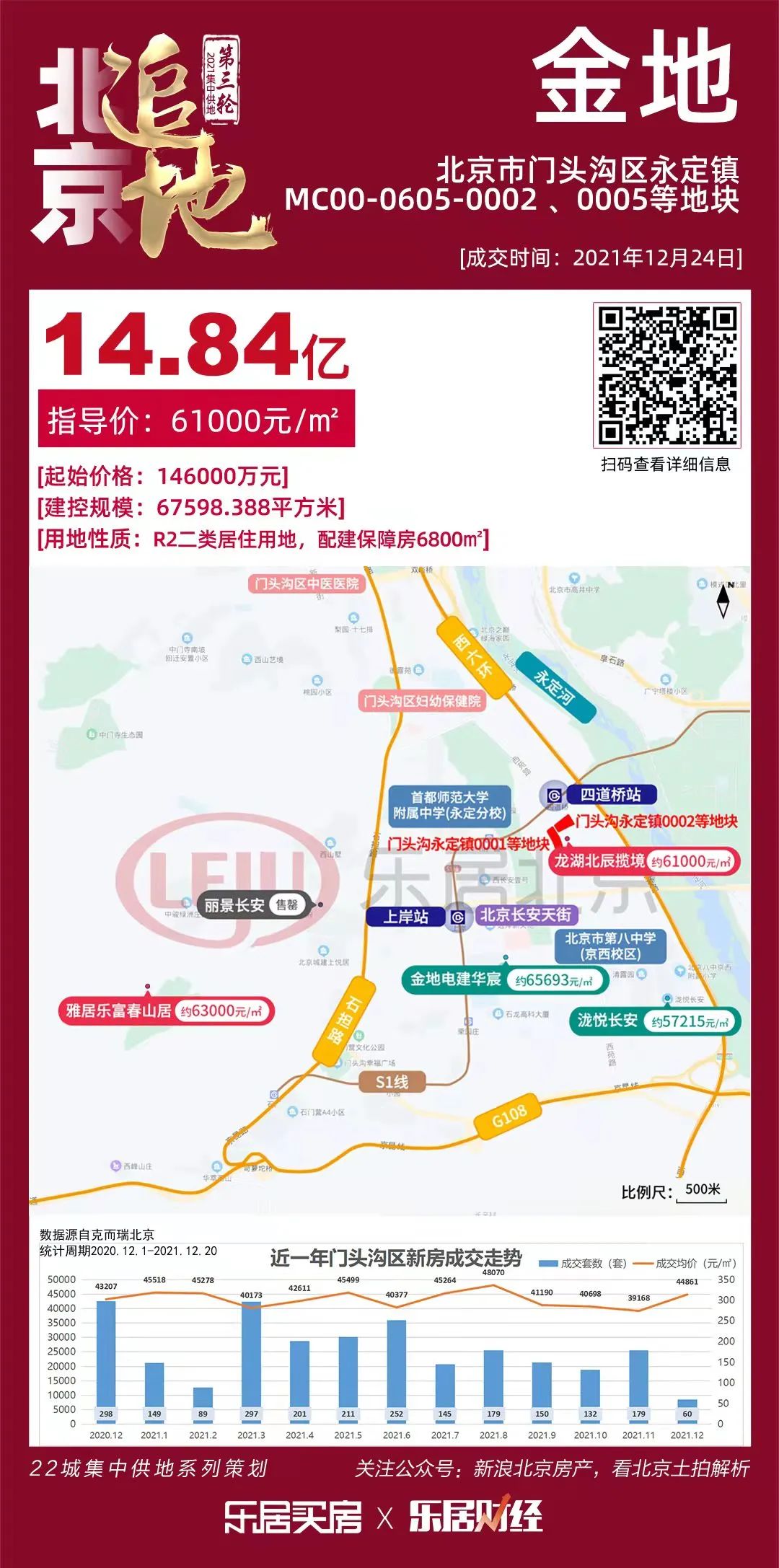 金地以14.84億摘得門頭溝永定鎮0002、0005地塊,溢價率1.64%。該宗地起拍價為14.6億元,建設用地面積2.5萬㎡,建筑面積約6.8萬㎡,需配建6800㎡“保障性租賃住房”。地塊容積率2.7,建筑控高60米。