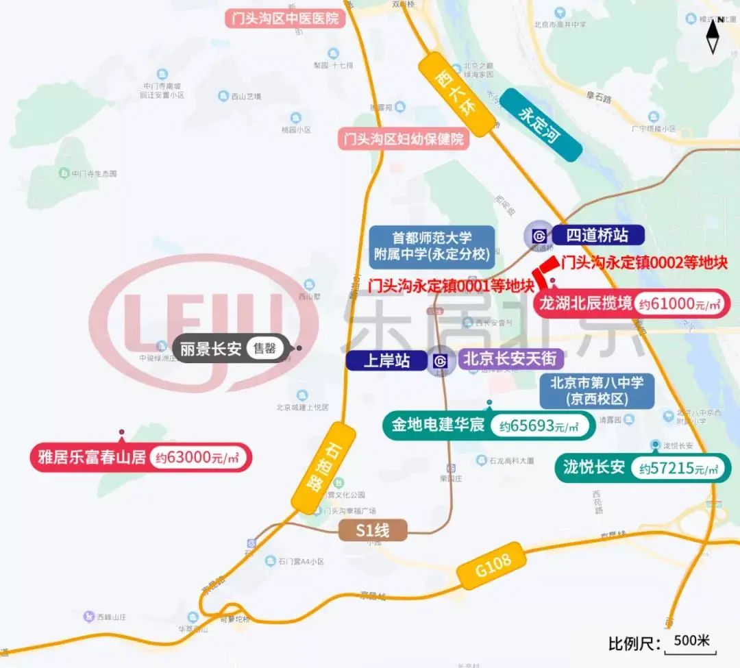 門頭溝2宗地,位于地鐵S1線四道橋站南側,緊鄰二批次集中供地成交的項目龍湖北辰攬境。周邊房價均價為4.5~5.5萬/㎡,例如西長安壹號30號院均價約為2.5萬/㎡,永興嘉園價格約在3.9萬/㎡。而一河之隔的石景山區可達到6萬/㎡左右,價格對剛需人群比較友善。