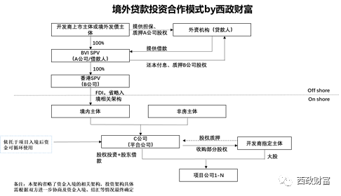 1.開發(fā)商上市主體或境外發(fā)債主體設(shè)立BVI SPV(即A公司)作為借款人;A公司設(shè)立全資B公司并通過外商投資方式最終與境內(nèi)非房主體共同成立C公司作為平臺公司。
