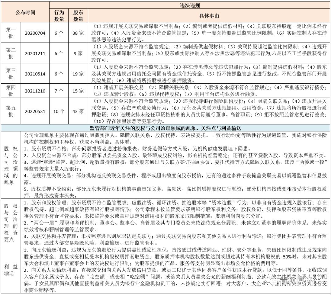(二)股東行為不合規不審慎。主要體現在股東入股資金不實、違規股權代持、主要股東違反“兩參一控”規定、主要股東違規干預經營管理、中小股東未能有效參與治理等以及股東資質未能持續符合監管要求、股東股權質押比例過高、銀行變相接受本行股權質押并提供授信、股東持股比例超過監管限制。