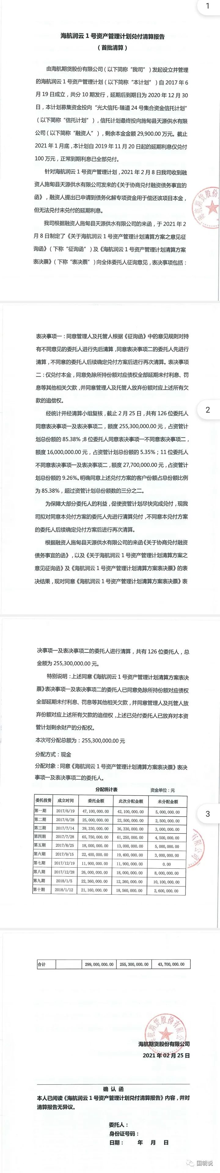 2021年2月25日,海航期貨發(fā)布了《海航潤(rùn)云1號(hào)資產(chǎn)管理計(jì)劃兌付清算報(bào)告(首次清算)》。