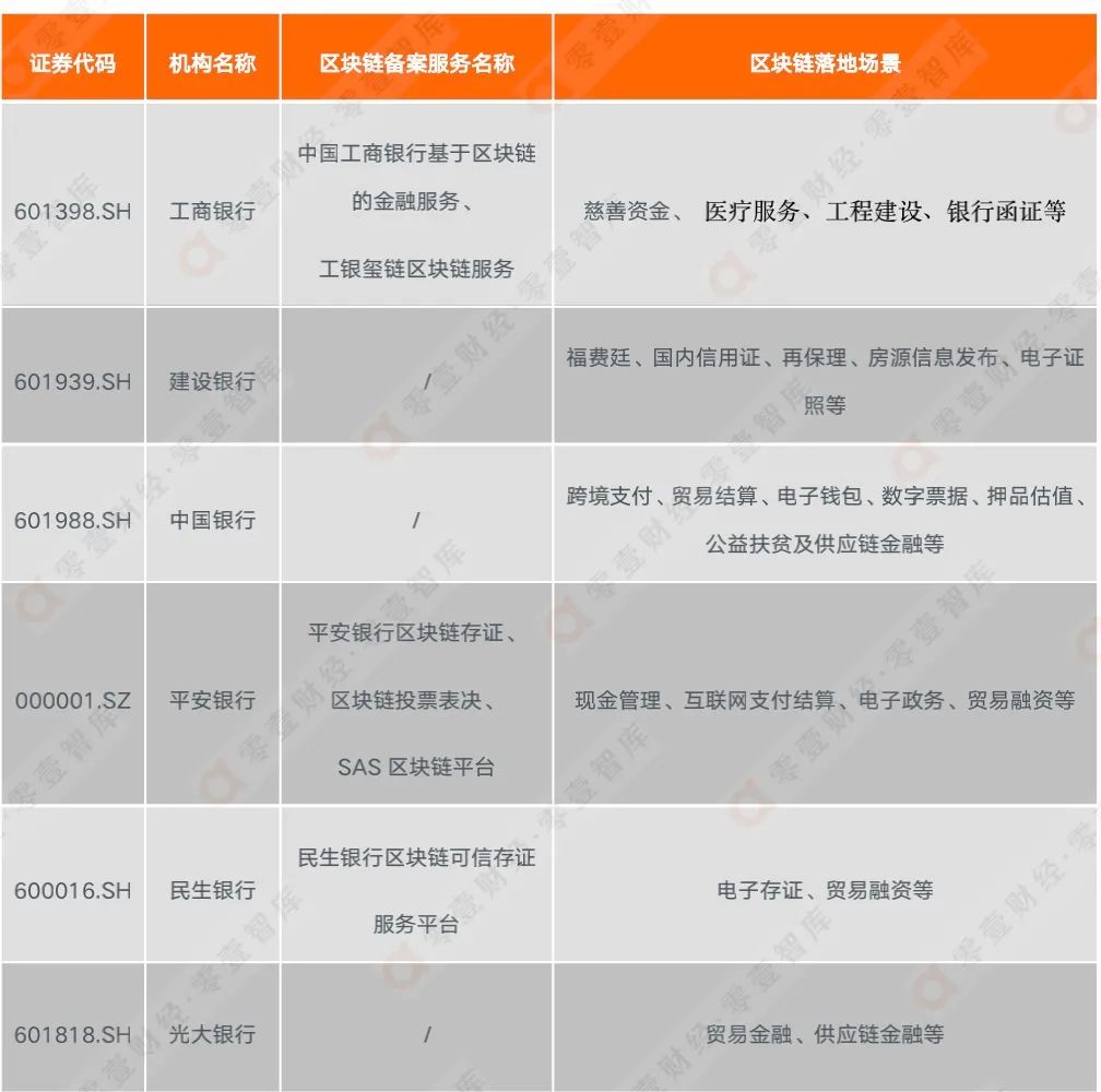為了解上市公司區(qū)塊鏈業(yè)務(wù)的開展路徑,零壹智庫分別從211家區(qū)塊鏈相關(guān)上市公司中選取了銀行、證券公司及其他領(lǐng)域10家代表性上市公司,對其區(qū)塊鏈業(yè)務(wù)開展方式、落地領(lǐng)域等進行了分析。