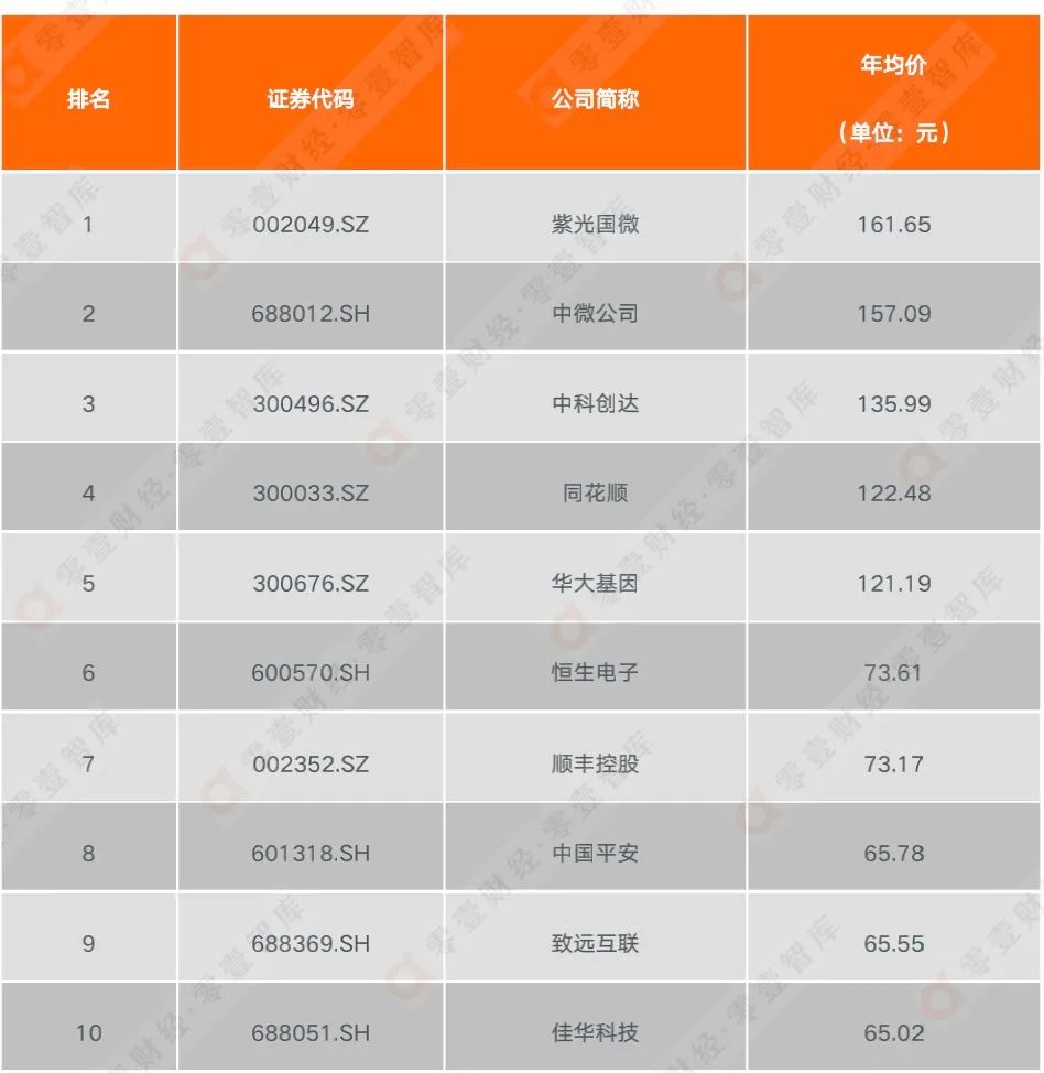 從股價表現(xiàn)上看,在211家區(qū)塊鏈上市公司中,紫光國微(002049.SZ)的年均價(時間區(qū)間為2020年12月31日至2021年12月31日)最高,為161.65元。除此之外,中微公司(688012.SH)、中科創(chuàng)達(300496.SZ)、同花順(300033.SZ)、華大基因(300676.SZ)等4家公司的年均價也均處在100元以上。