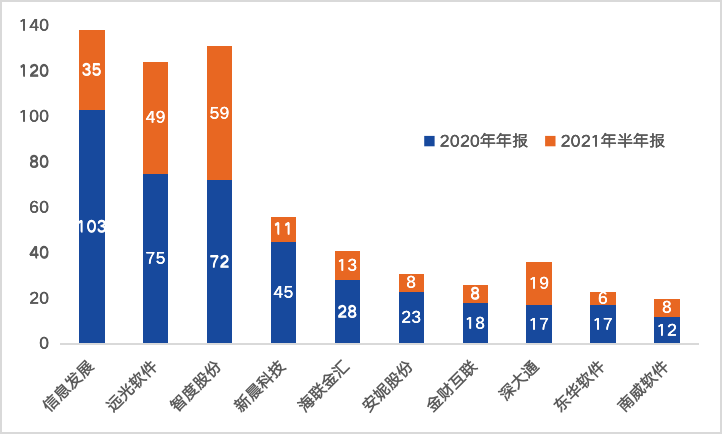 圖:2020年報、2021半年報中提及“區(qū)塊鏈”次數(shù)較多的上市公司