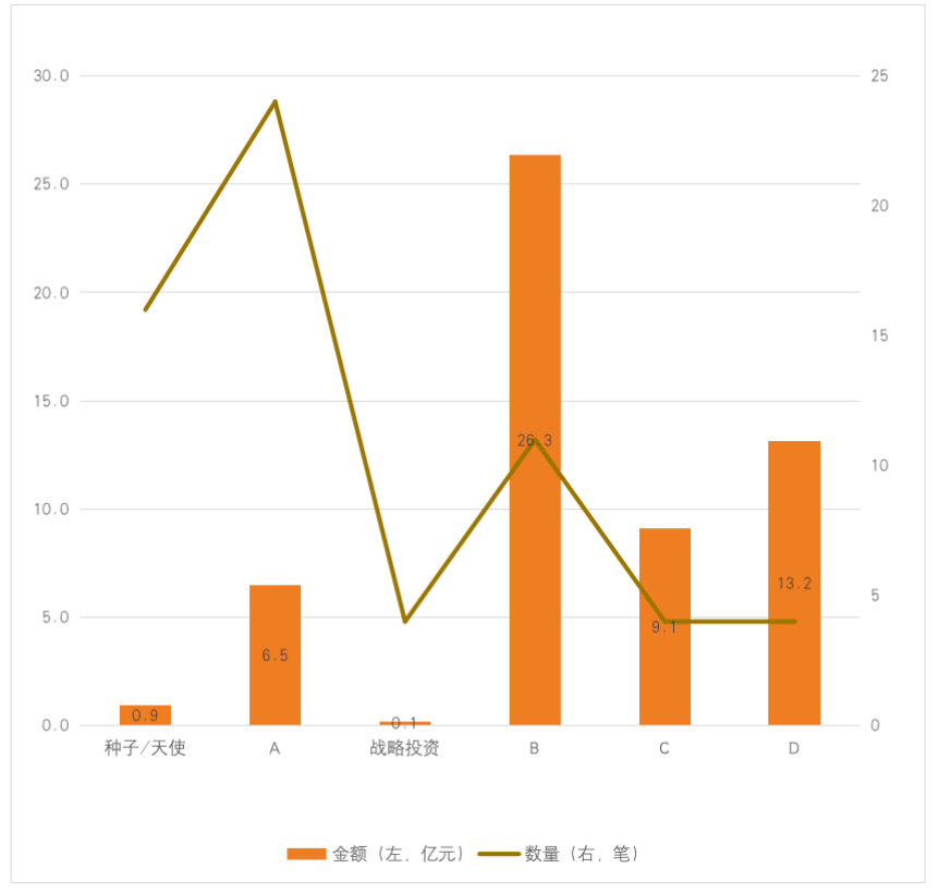 整體而言,A輪及其之前的融資數(shù)量為40筆,公開披露的融資總額約為7.4億元;B輪融資11筆,對應(yīng)的金額高達(dá)26.3億元。早期階段(B輪及其以前)的融資數(shù)量占81.0%,大多數(shù)企業(yè)尚未形成成熟的商業(yè)模式。C輪和D輪融資各4筆,融資總額分別為9.1億元和13.2億元。