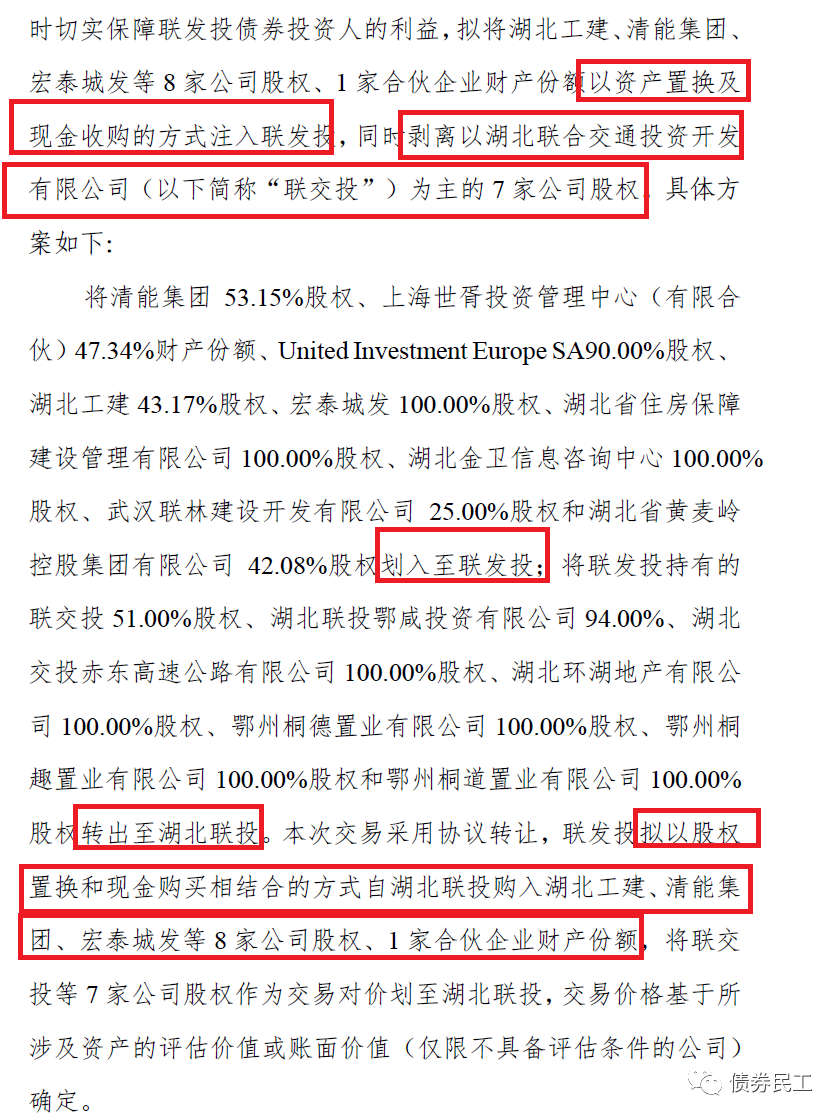 本次資產(chǎn)重組的方案中,需要關(guān)注的是重組方式,湖北聯(lián)發(fā)投是以“股權(quán)置換和現(xiàn)金購買相結(jié)合的方式”購入了標(biāo)的資產(chǎn)。持有人會(huì)議公告中并未明確現(xiàn)金購買的具體金額。從城投公司資產(chǎn)重組的實(shí)踐來看,一般是通過資產(chǎn)無償劃轉(zhuǎn)或者股權(quán)置換的方式進(jìn)行,通過現(xiàn)金購買方式的案例相對較少。現(xiàn)金購買方式,會(huì)讓城投公司有一定的現(xiàn)金支出,需要重點(diǎn)關(guān)注現(xiàn)金支出的金額、現(xiàn)金支出的比例、現(xiàn)金支持的時(shí)間安排、標(biāo)的資產(chǎn)的定價(jià)等多個(gè)因素。
