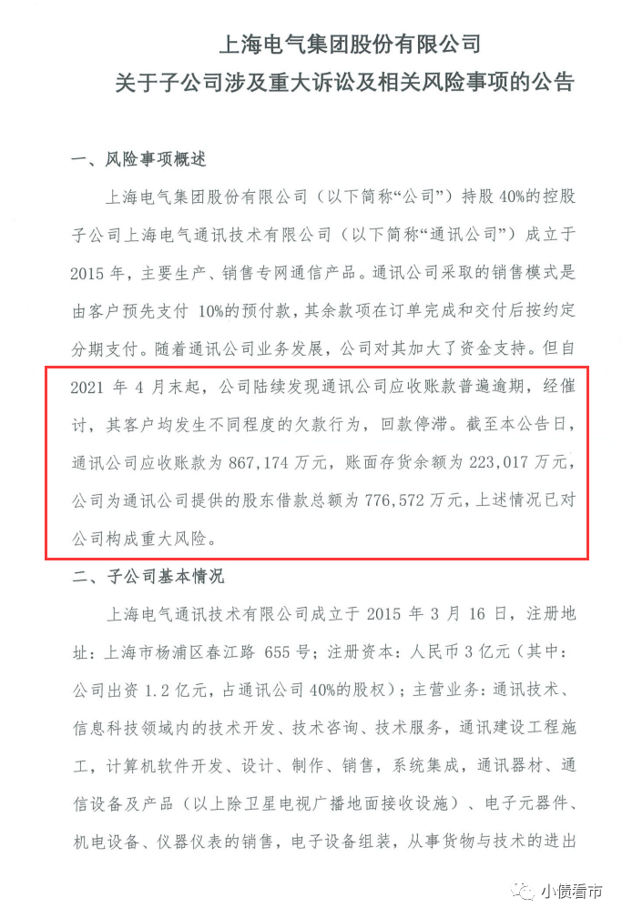公告顯示,通訊公司應收賬款余額為86.72億元,賬面存貨余額為22.3億元,上海電氣向通訊公司提供的股東借款金額合計為77.66億元,均存在重大損失風險。