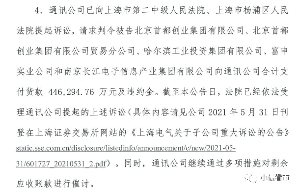 上海電氣稱,已針對拖欠子公司貨款的四家公司采取措施,包括向法院提起訴訟等。