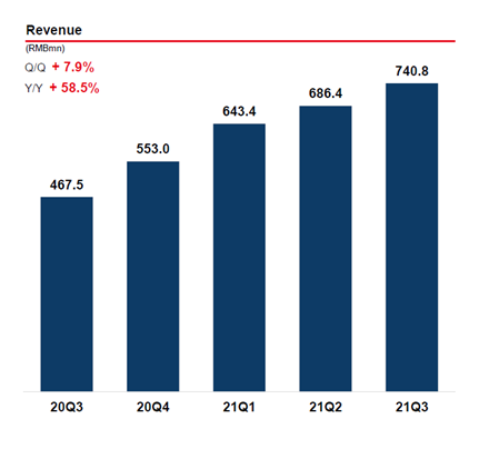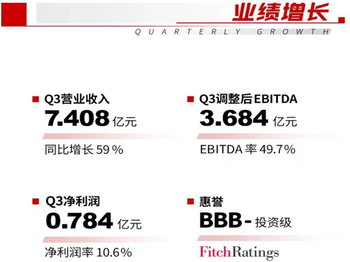 報(bào)告顯示,三季度公司實(shí)現(xiàn)主營(yíng)業(yè)務(wù)收入7.41億元人民幣,同比增長(zhǎng)59%;實(shí)現(xiàn)調(diào)整后的凈利潤(rùn)達(dá)7800萬元,利潤(rùn)率達(dá)10.6%;調(diào)整后的EBITDA(稅息折舊及攤銷前利潤(rùn))達(dá)3.68億元,同比增長(zhǎng)61.57%。