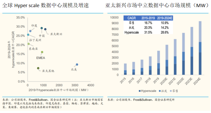 根據(jù) Frost&Sullivan 數(shù)據(jù),從全球范圍看,亞太新興市場(chǎng)的超大型數(shù)據(jù)中心市場(chǎng)規(guī)模僅次于北美地區(qū):2019 年總負(fù)載達(dá)到 1120MW,且成長(zhǎng)性突出,是全球增速最快的地區(qū)。