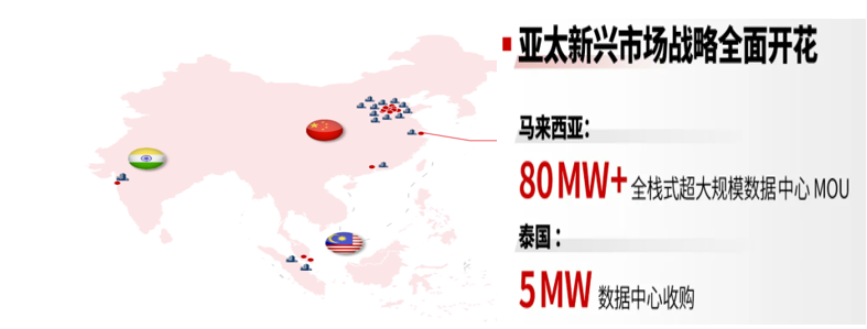 海外客戶對(duì)超大型數(shù)據(jù)中心的需求,以及秦淮數(shù)據(jù)的細(xì)分定位,幫助公司業(yè)務(wù)從中國延伸至海外的馬來西亞、印度和泰國市場(chǎng),并逐漸與全球云廠商建立合作關(guān)系。