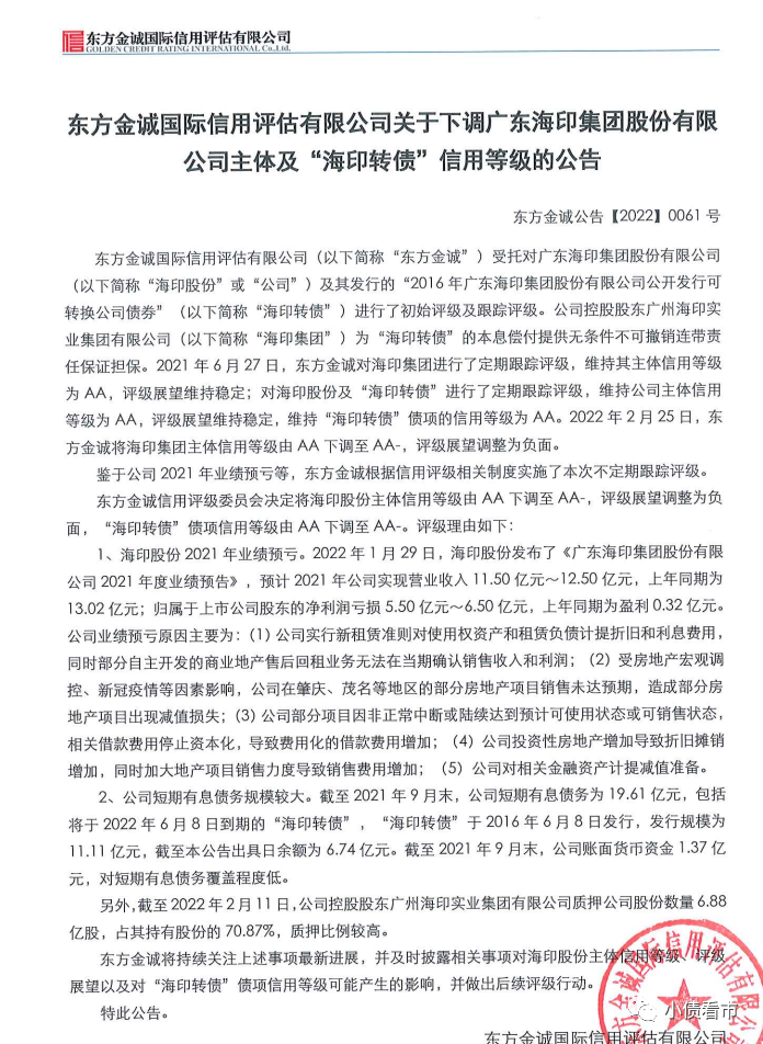 2月25日,東方金誠公告稱,決定將海印股份(000861.SZ)主體信用等級由“AA”下調(diào)至“AA-”,評級展望由“穩(wěn)定”調(diào)整為“負面”,“海印轉(zhuǎn)債”債項信用等級由“AA”下調(diào)至“AA-”。