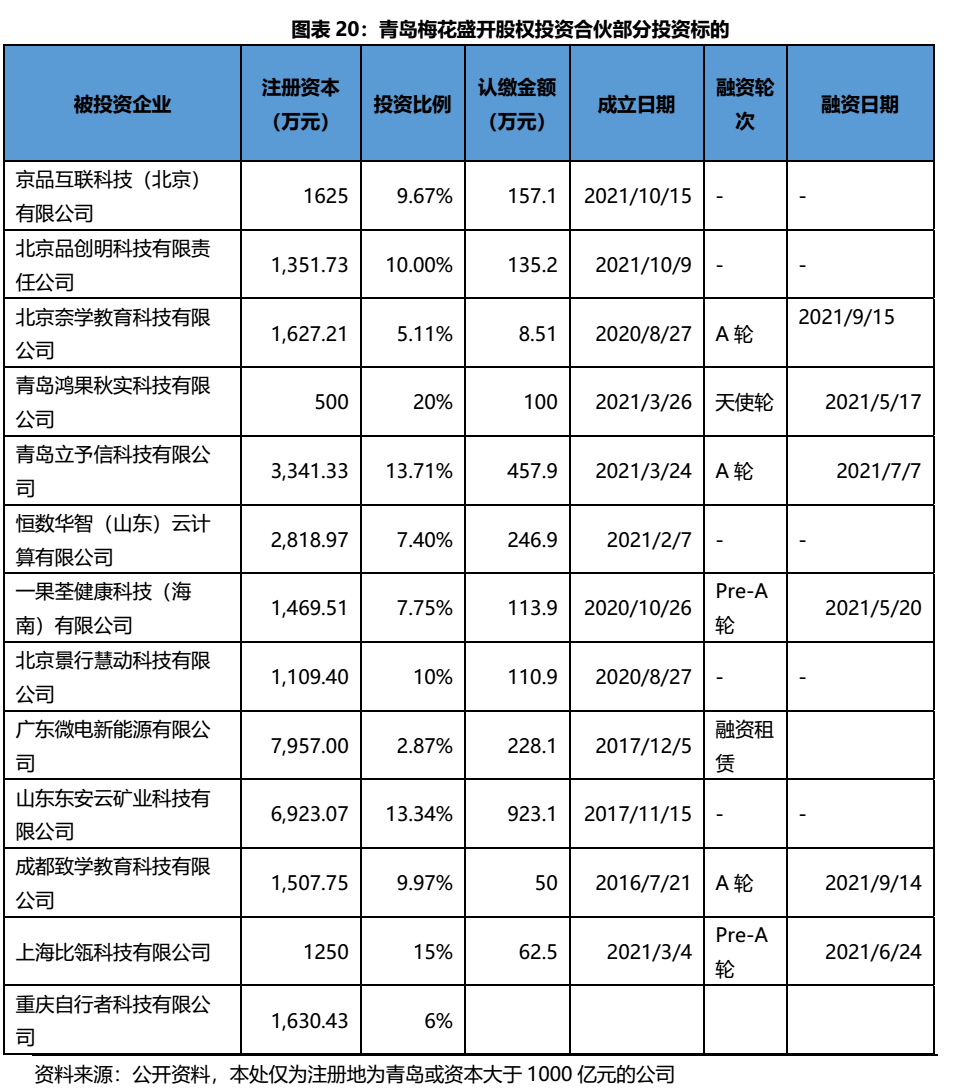 在分析后發(fā)現(xiàn),青島科創(chuàng)母基金作為2019年開(kāi)始的基金,仍處于一期投資階段;在其自身和投資對(duì)象的股東中,可以看見(jiàn)青島巨峰科技、青島城投、青島國(guó)信、青島城陽(yáng)開(kāi)發(fā)、山東高速、青島海洋科技、青島海發(fā)、青島投資、城發(fā)投資等城投的身影;而作為青島科創(chuàng)母基金四大投資方向,工業(yè)互聯(lián)網(wǎng)、先進(jìn)制造、新基建和生命科學(xué),目前投資集中在工業(yè)互聯(lián)網(wǎng),而新基建部分金額相對(duì)較少。投資的主體大多處于A輪或B輪融資階段,產(chǎn)業(yè)化參與較深。
