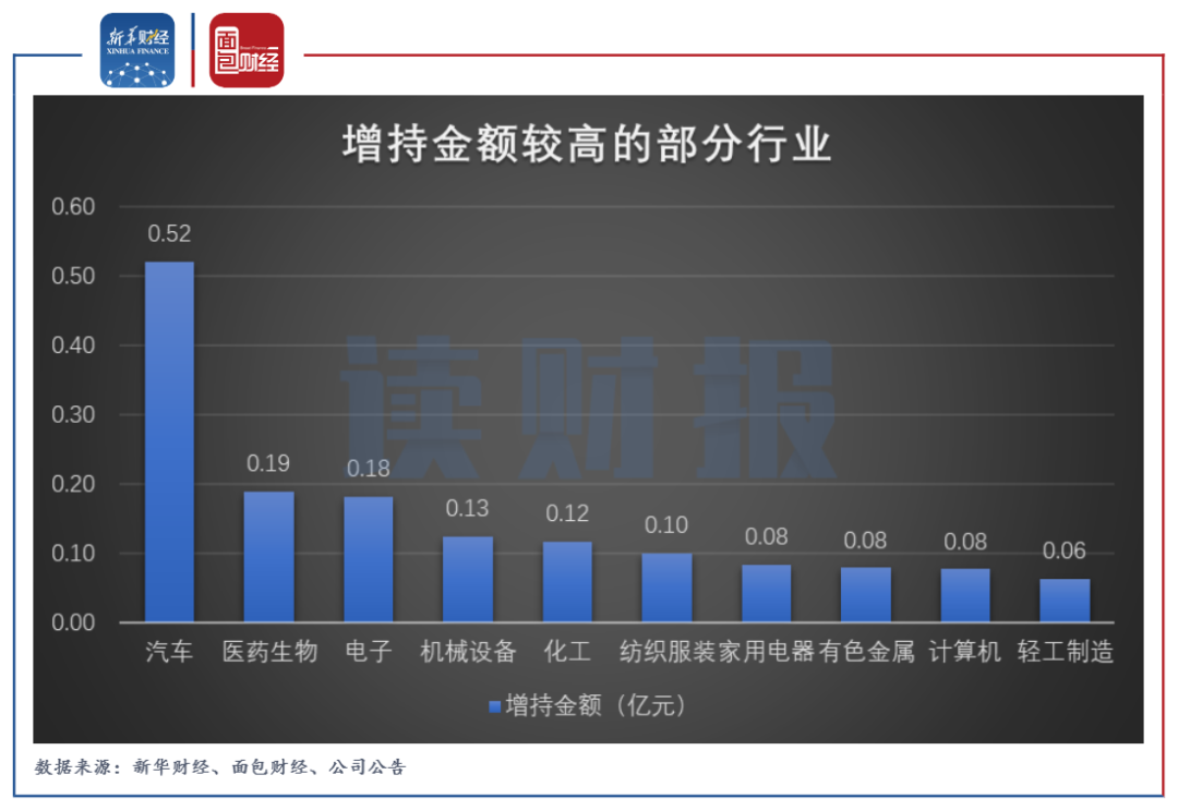 申萬行業分類下,汽車行業的增持金額排在首位,約為0.52億元,醫藥生物行業的增持金額排在第二,約為0.19億元。電子行業的增持金額也排名靠前,約為0.18億元。