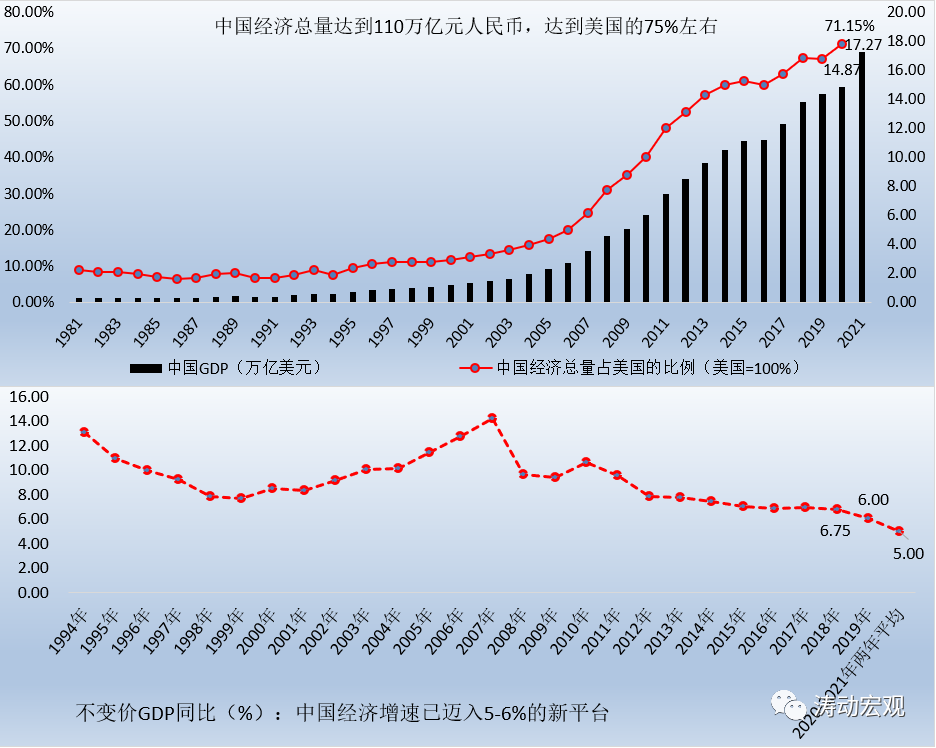 2021年12月11日,中財辦韓文秀副主任指出2021年中國經(jīng)濟總量將達到110萬億元人民幣(按照6.37的匯率測算約為17.27萬億美元),相當于美國經(jīng)濟總量的75%左右,較2020年經(jīng)濟總量突破100萬億元人民幣又進了一步。
