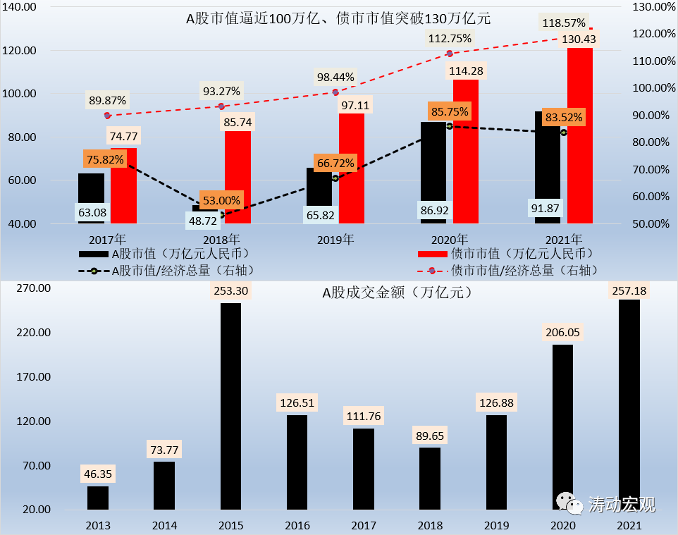 股票市值和債市市值占經(jīng)濟總量的比例,往往代表著一體經(jīng)濟體的金融深化程度,數(shù)值上顯示,2021年A股市值和債市市值已分別達到91.87萬億和130萬億元左右,占經(jīng)濟總量的比例亦分別達到90%和120%左右。