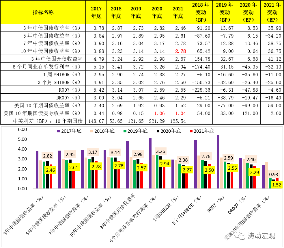 如果不考慮2020年的特殊年份,則中國債市自2018年起已連續(xù)牛了四年。以10年期中國國債收益率為例,2018年下行65.42BP、2019年下行9BP、2020年微幅上揚0.64BP、2021年下行36.75BP,也即2018年以來已累計110BP,而10年期國債收益率亦已降至2.80%以下,中美利差相應(yīng)收窄至120-130BP之間。