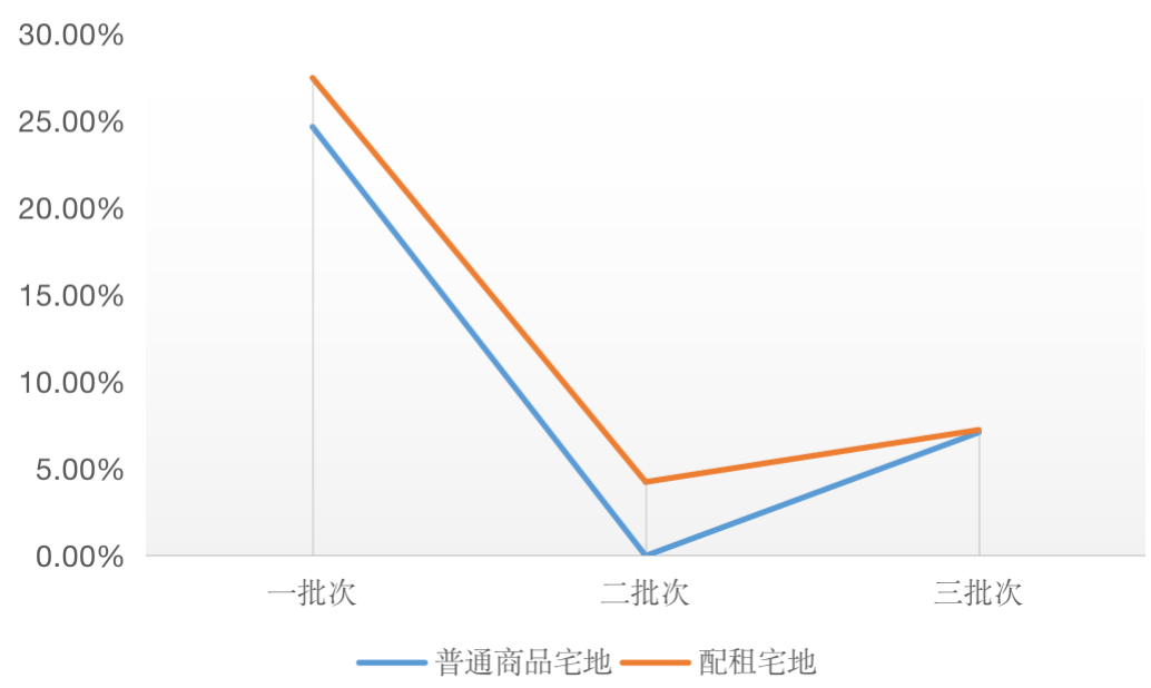 從成交溢價(jià)率來(lái)看,配租宅地的平均成交溢價(jià)率往往也高于普通商品住宅地塊,即使在熱度明顯下降的第二批也是如此。