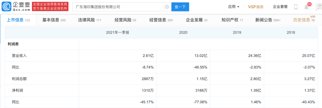 根據(jù)企查查,2018年以來,海印股份業(yè)績出現(xiàn)不同程度下降,2020年?duì)I收13.02億元,同比下降46.55%;凈利潤0.32億元,同比下降77.06%。截至2021年一季度,營收2.61億元,同比下降8.74%;凈利潤0.13億元,同比下降45.17%。