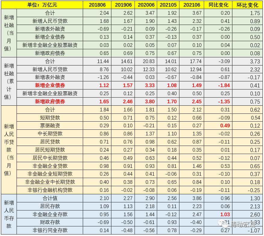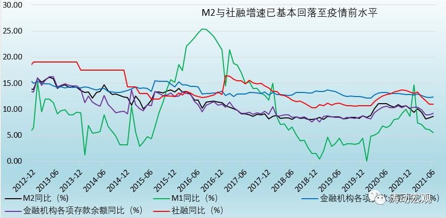 近年來的政策均明確“保持M2、社融增速與名義經(jīng)濟(jì)增速基本一致”,并以此為基礎(chǔ)保持宏觀杠桿率水平基本穩(wěn)定。雖然今年6月的M2與社融大超預(yù)期(票據(jù)融資和企業(yè)中長(zhǎng)期貸款同比明顯多增、房貸少增、企業(yè)存款同比亦大幅多增),但增速基本上已回歸到疫情前的水平,較疫情期間下降明顯(今年前6個(gè)月企業(yè)債券和政府債券同比分別少增1.84萬億和1.35萬億、合計(jì)少增3.19萬億)。例如,2021年6月,M2、社融存量、貸款余額與存款余額同比增速分別降至8.60%、11%、12.30%和9.20%,已經(jīng)和疫情前的平均水平相當(dāng)。