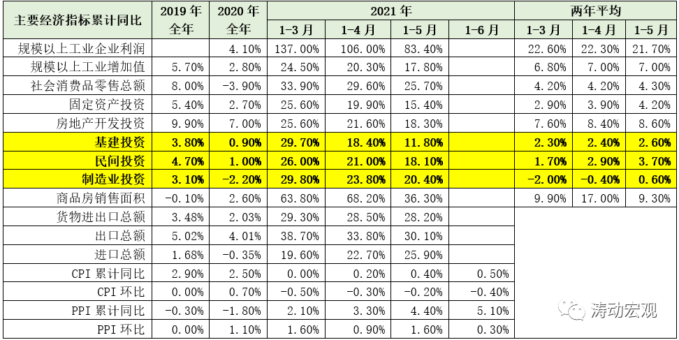 (二)從三駕馬車的表現(xiàn)來看,消費(fèi)與投資等內(nèi)需整體上仍處于低位緩慢修復(fù)態(tài)勢(shì),房地產(chǎn)投資與貿(mào)易端延續(xù)了2020年的表現(xiàn),對(duì)上半年的經(jīng)濟(jì)修復(fù)貢獻(xiàn)力度較大,如1-5月的房地產(chǎn)投資累計(jì)同比、貨物進(jìn)出口總額累計(jì)同比分別達(dá)到8.60%和28.20%。其中,房地產(chǎn)投資累計(jì)同比的兩年平均值高達(dá)8.60%,1-5月民間投資與制造業(yè)投資累計(jì)同比的兩年平均值則分別為3.70%和0.60%,較2019年的水平還有不少距離。