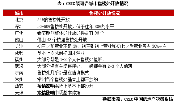 線下售樓處開放率偏低,并且多數(shù)都以2-3人值班為主。根據(jù)CRIC調(diào)研數(shù)據(jù),深圳僅有50%-60%左右售樓處開放,相較往年的80%有明顯下滑,北京疫情突襲,售樓處開放率也僅有54%。武漢、福州、濟南等雖然未關(guān)閉售樓處,但也只有2-3人值班,保證最基本的接待能力。長沙、成都等地春節(jié)期間大部分都直接放假,直到年后才恢復(fù)正常開放。而天津和西安由于疫情影響,整個1月連帶春節(jié)基本都處于停擺狀態(tài),線下售樓處開放程度很低。