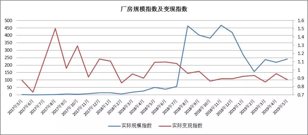 趨勢分析:工業(yè)用房成交量在 2018年8月與11月規(guī)模激增,之后開始下降,至2019年3月有所增加,4月、5月總體平穩(wěn);工業(yè)類房產(chǎn)的變現(xiàn)指數(shù)自2018年5月以來顯著持續(xù)下滑,仍有下滑趨勢。