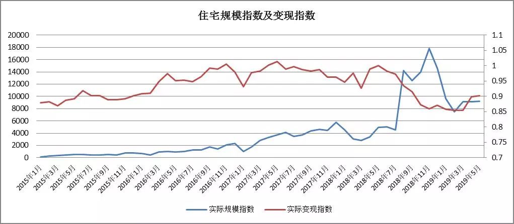 趨勢分析:住宅類房產(chǎn)的成交量自2015年1月以來至2018年8月呈指數(shù)型增長,此后成交量在高位震蕩了4個月后開始逐漸下滑;2015年1月至今,住宅類房產(chǎn)的變現(xiàn)能力呈現(xiàn)出先增后降的趨勢,2018年5月以后開始逐漸下滑,2019年5月的月度平均變現(xiàn)折扣率僅為90.19%。