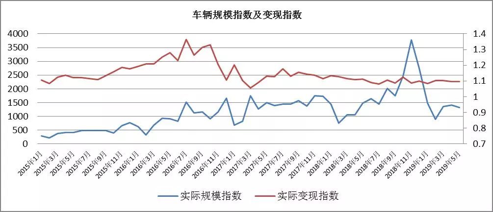 趨勢分析:車輛成交規(guī)模在2019年1月達到交易高峰,之后大幅下滑。機動車類資產(chǎn)變現(xiàn)能力非常強,絕大多數(shù)月份的平均變現(xiàn)折扣率都在110%以上,目前變現(xiàn)指數(shù)趨于穩(wěn)定,存在溢價空間,在105%上下。