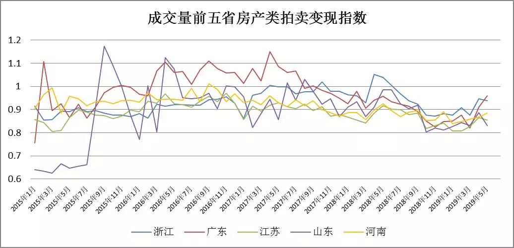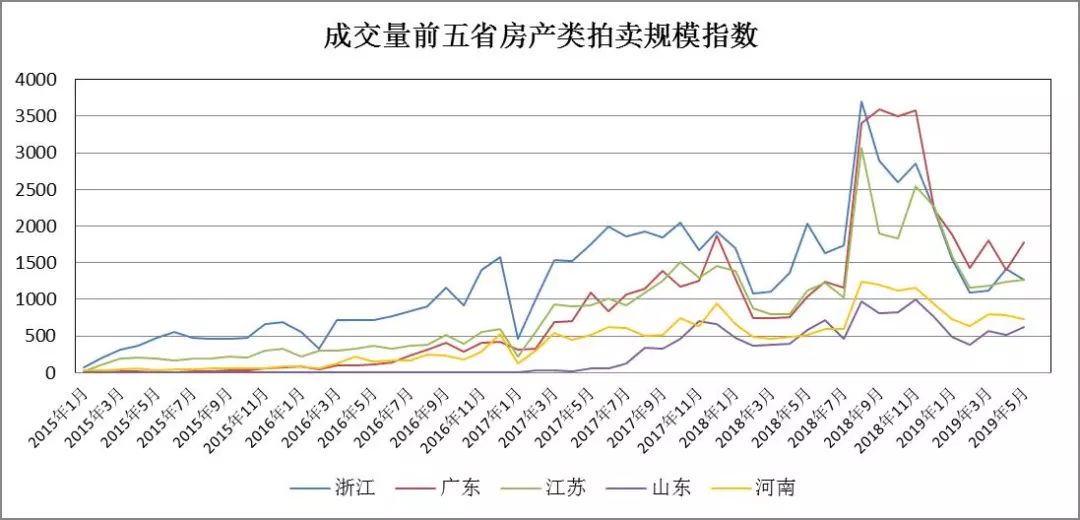 從各省房產(chǎn)類拍賣成交規(guī)模來看,整體上廣東、江蘇、浙江三省領(lǐng)跑全國,成交量峰值均在單月3000筆以上,其中浙江省2018年8月成交3708筆,創(chuàng)下目前最大單月成交量。各省規(guī)模指數(shù)走勢與全國走勢基本一致。從2015年初到2017年底為快速增長期,其后經(jīng)歷了一次低谷,到2018年下半年開始沖擊新高,此后的走勢有所分化,浙江省、江蘇省、山東省經(jīng)歷了劇烈波動后開始下滑,廣東省、河南省則在高位持續(xù)半年后開始快速下滑,隨后趨于平穩(wěn)。