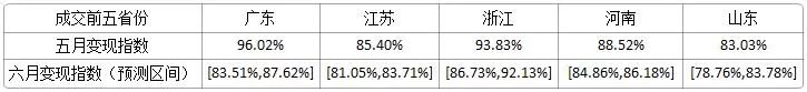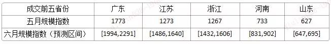 相較于五月份的規(guī)模指數(shù),預(yù)測成交前五省的規(guī)模指數(shù)在六月份呈上升趨勢,其中,山東省增速較緩。