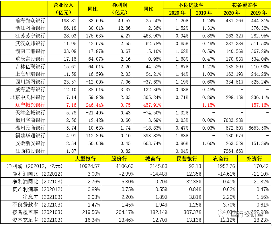 (3)2020年與2021年一季度民營銀行凈利潤同比增速分別為12.35%和32.38%,遠遠優于同期其它類型銀行。