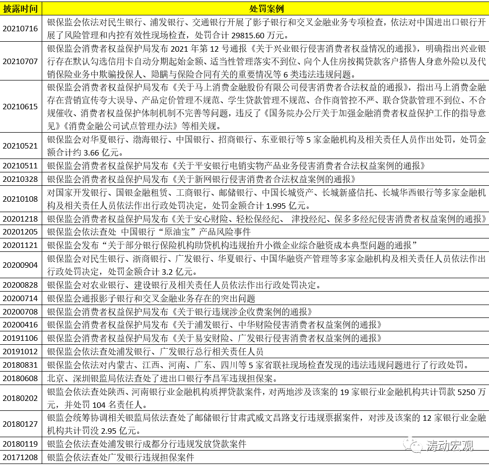 整體上看,雖然銀保監會及地方銀保監局處罰的案例很多且2020年以來發布頻率明顯提升,但真正通過官網進行披露的并不多,這些被披露的案例大多警示意義成分更明顯,預計各地銀保監局在具體實操時也會爭相效仿。