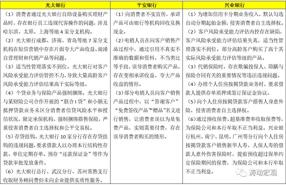 2、民生銀行、浦發銀行與交通銀行分別在同業、理財與委托貸款等業務存在如下問題:(1)內控管理不完善,業務制度不健全,前期檢查發現的部分違法違規行為整改不到位,甚至屢查屢犯;(2)風險隔離不到位,理財產品之間、理財產品與自營業務之間的不當交易仍時有發生;(3)產品管理不規范,未完全執行“穿透式管理”要求,部分理財產品未準確登記、報告和披露底層資產信息;(4)為房地產市場或地方政府違規提供融資。