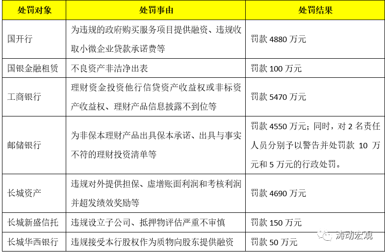 2021年1月,銀保監會對國開行、國銀金融租賃、工商銀行、郵儲銀行、長城資產、長城新盛信托、長城華西銀行等多家金融機構及相關責任人員處罰金額合計1.995億元,處罰事由包括違規為政府融資、不良資產非潔凈出表、理財資金投資他行資產收益權、為非保本理財產品出具保本承諾、違規對外擔保等。