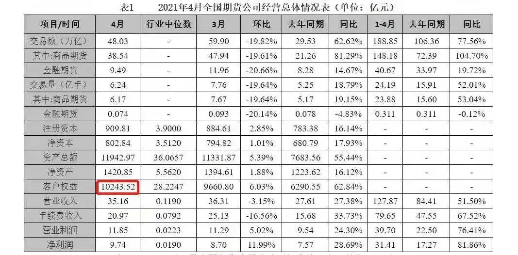 根據(jù)中國(guó)期貨業(yè)協(xié)會(huì)最新發(fā)布的數(shù)據(jù)顯示,截止到4月底,期貨市場(chǎng)客戶權(quán)益金額已達(dá)到了10,243.52億元,這是期貨歷史上首次突破萬(wàn)億元大關(guān)。