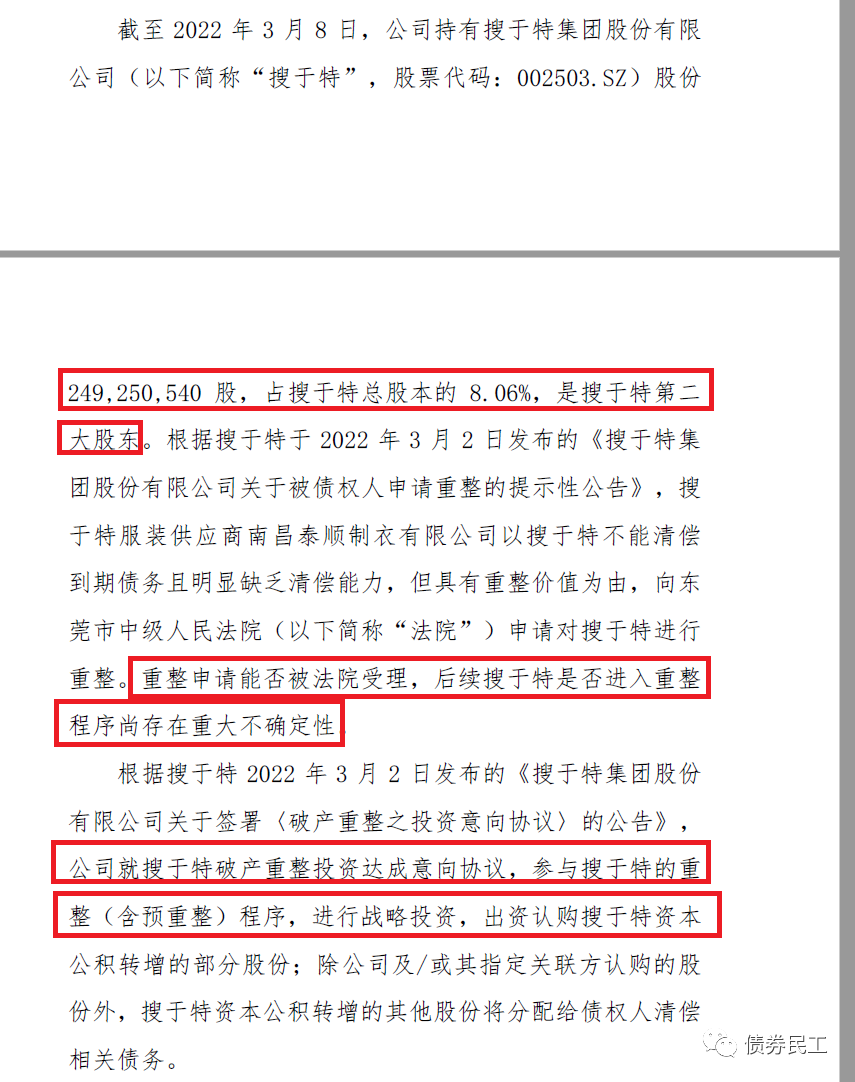 根據中證鵬元于2022年3月15日披露的關注公告,廣州高新區投資集團有限公司(以下簡稱“廣州高新投”)就搜于特集團股份有限公司(以下簡稱“搜于特”)破產重整投資達成意向協議,參與搜于特的重整程序,進行戰略投資。也就是說,廣州高新投直接參與了上市公司的破產重整程序,這對于城投公司來說,并不是很多見。