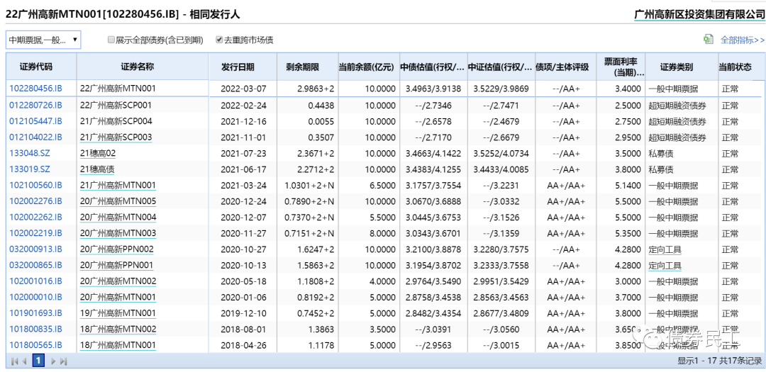 根據公開披露信息,廣州高新投目前存量債券17只,存量債券金額為132.50億元,債券產品包括中期票據、定向工具、超短融和私募債等類型,尚未發行過企業債券。