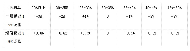步驟1的萬能公式中,土增稅是取平均值5%,增值稅取平均值3.5%。土增稅和增值稅對凈利率的影響是通過毛利率(沒有扣除增值稅毛利率)來對85%進行調整的,經驗值如下: