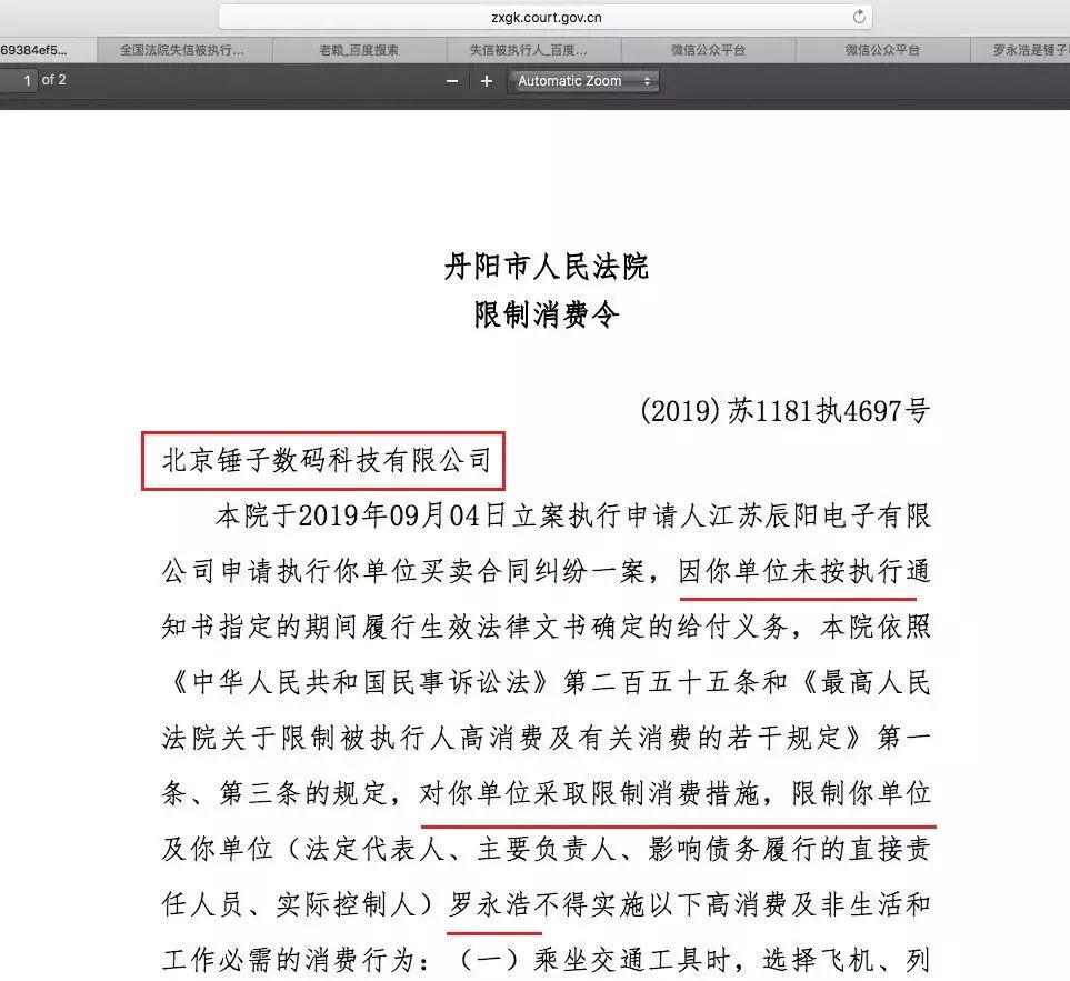一、羅永浩并不是被執行人,限制消費令載明的被執行人為北京錘子數碼科技有限公司,而非羅永浩。消費令見下圖(執行信息公開網http://zxgk.court.gov.cn/xgl/可供查詢)